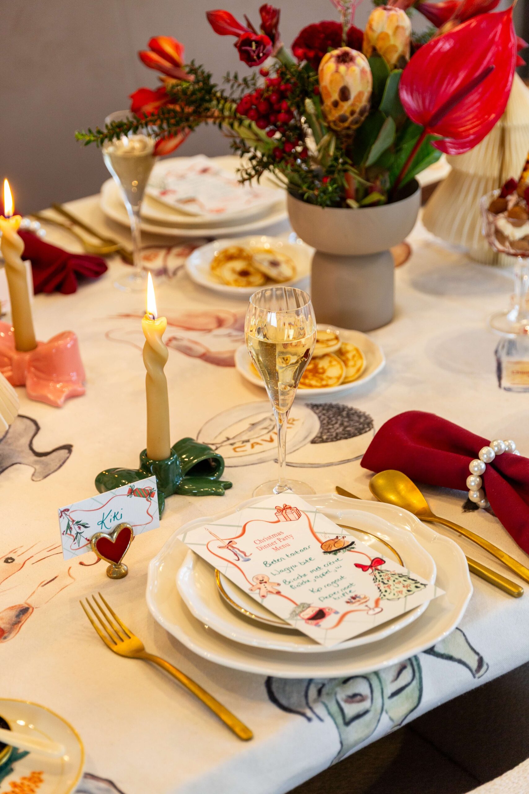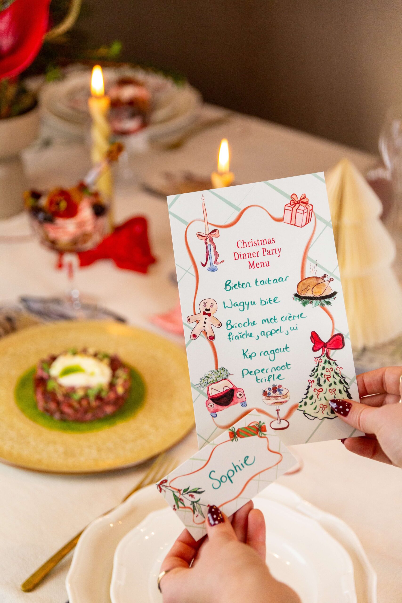 Deze Kerst Special bestaat uit 6 menukaartjes en 6 bijpassende naamkaartjes. Een complete set voor jouw feestelijk gedekte tafel. De handgeschilderde illustraties zijn omgetoverd tot een warme, cosy kersteditie vol twinkelende details en klassieke kerstkleuren. Met liefde en aandacht gemaakt om jouw kerstdiner nét dat extra beetje sparkle te geven.
